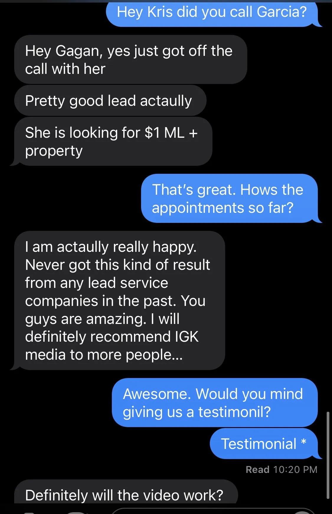 “IGK Media is the best lead source that I have used in my career. I don't even call the leads because they generate & qualify the leads for me. All I have to do is show up to the meetings booked with pre-qualified leads."